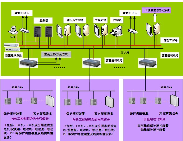 本系统的总体方案采用符合国际开放系统标准的全分布式结构,能方便地接入不同厂家的微机保护及用户其它自动化系统,方便与DCS/FCS/SIS等自动化系统通讯,特别是取消了传统方式下与DCS进行信息交换的硬接线和大量变送器,采用全通讯的方式将发电厂电气监控系统纳入DCS,实现了火电厂机、炉、电系统的一体化监控思想。提高了发电厂信息化、数字化、自动化以及可靠性水平。